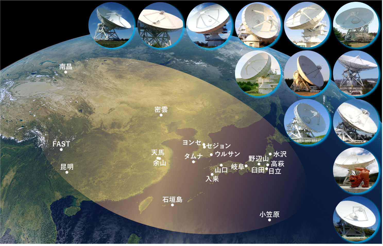 [画像4] 東アジアVLBIネットワークの望遠鏡配置図。望遠鏡画像は2017年の観測キャンペーンに参加した13台の電波望遠鏡。 画像クレジット:国立天文台