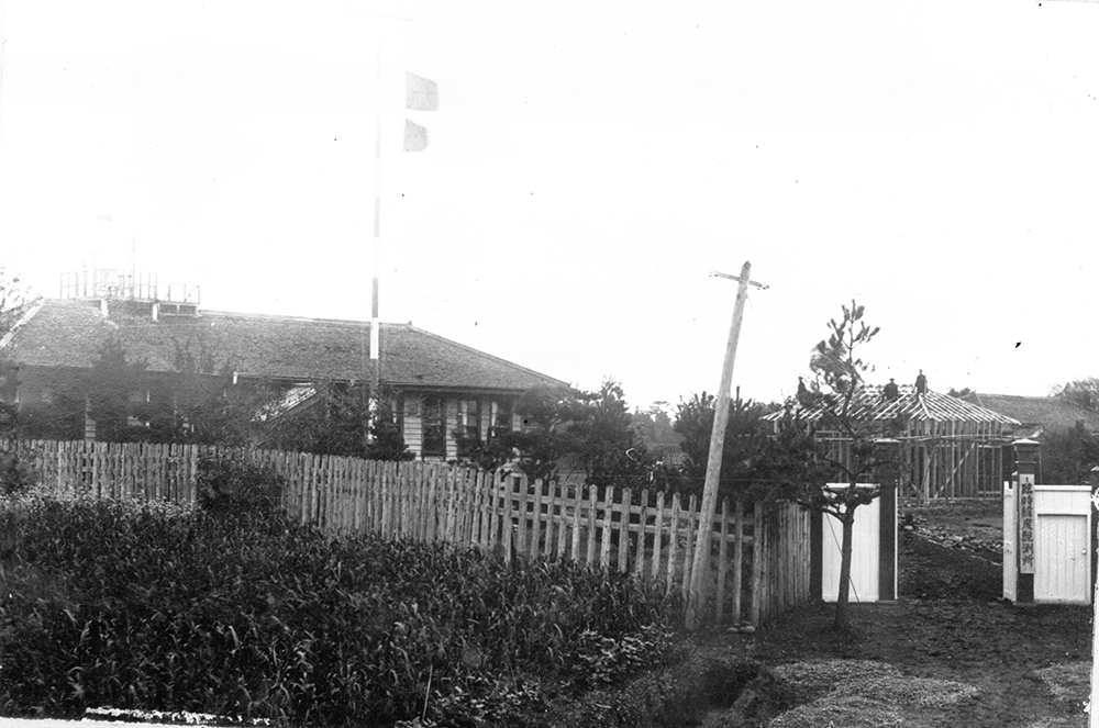 臨時緯度観測所の事務所(本館)と正門。1900(明治33)年竣工。木造平屋建。事務所の建物(国登録有形文化財)は現在、木村榮記念館として保存・活用されている。