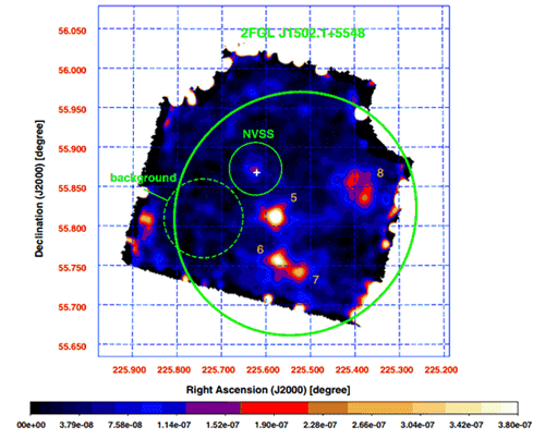 そのうちひとつ、ガンマ線源:2FGL J1502.1+5548 とそれに対応すると考えられる電波源:NVSS J150229+555204 から、X線および電波が検出されました。(X線画像:図1、電波画像:図2)