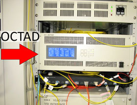 光結合データ取得システム(OCTAVE-DAS)の一部で, アナログの電気信号をコンピューター処理し易い様に, デジタル信号に変えています. 変換されたデジタル信号は, 光ケーブル(図中の黄色いケーブル)を使って記録装置(OCTADISK)に送られます. (提供:国立天文台)