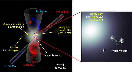 We detect a high-velocity outflow at 50 km/s emanating from G25.82-W1 toward north and south (upward and downward; Figure 2). Overall, a system containing an outflow associated with rotating gas (perhaps related to a circumstellar disk) seems analogous to those of low-mass protostars. “This study untangled the complicated structure of a high-mass cluster-forming region and showed that a high-mass star in G25.82-0.17 is forming in a similar manner to Solar-type stars.” commented Kee-Tae Kim (director of radio astronomy division in KASI), a Korean co-chair of the KaVA large program for star-formation studies, on the significance of the present study.