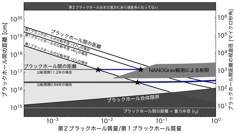 青色の線分が、許容される第2ブラックホールの質量と第1ブラックホールの質量比を表しています。灰色で塗られた領域は、巨大ブラックホール連星としての条件を満たさず、除外された領域を示します。