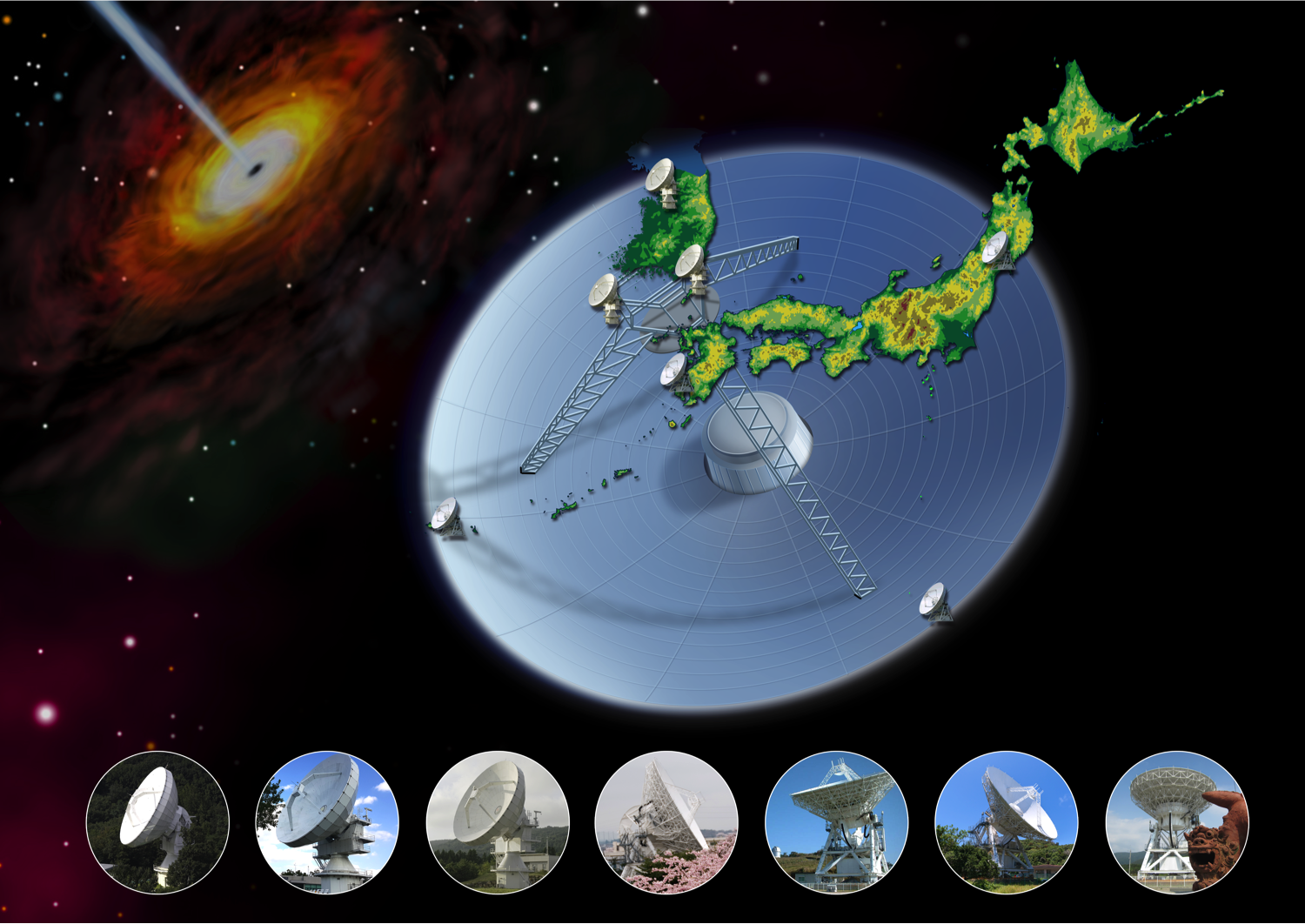 【図1】日韓合同VLBI観測網(The KVN and VERA Array, 通称KaVA)。下は本観測に参加した各観測局で、左からKVNのヨンセイ局(ソウル)、ウルサン局、タムナ局(済州)、VERA水沢局、入来局、小笠原局、石垣局にある電波望遠鏡の写真。