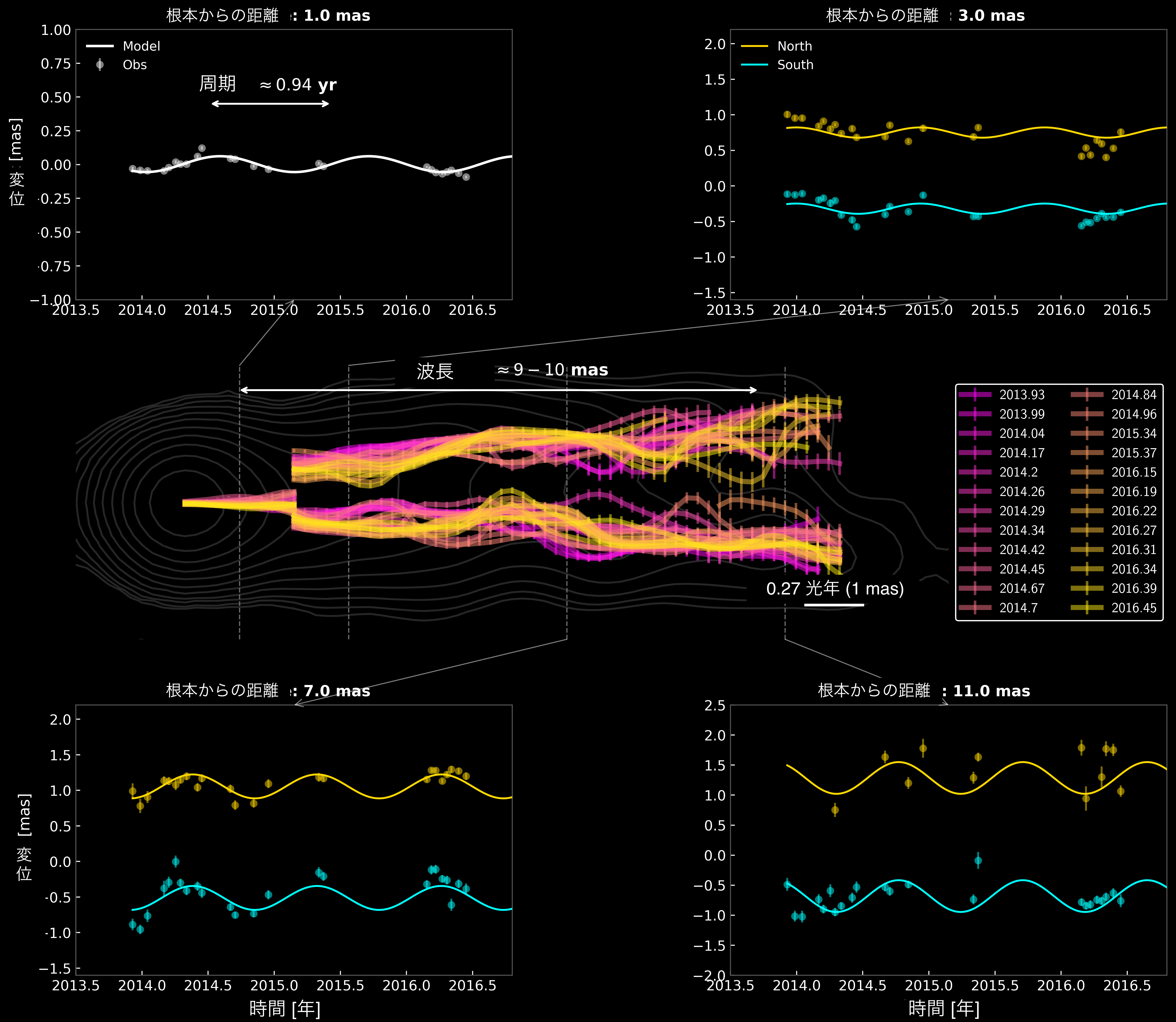 周囲の4パネル:コアから1, 3, 7, 11 masの距離における各断面において観測された横方向振動を示しています。データ点は観測された横方向変位、実線は最良フィットモデルを示しています。横軸は時間(年)、縦軸はジェット軸に対する横方向の変位(ミリ秒角)です。振動周期は約0.94年です。